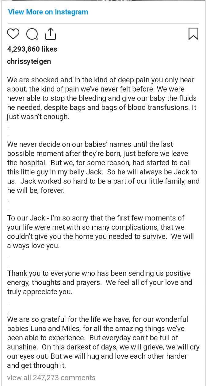 Music star, John Legend and his wife Christy Teigen have announced the death of their new born baby after giving birth.