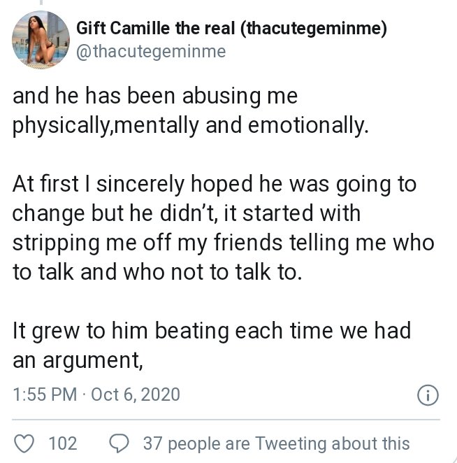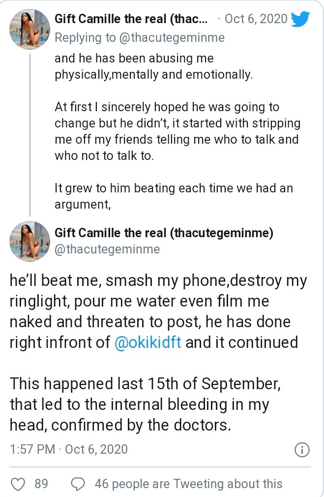 At first, I sincerely hoped he was going to change but he didn’t, it started with stripping me off my friends telling me who to talk and who not to talk to. It grew to him beating each time we had an argument, he’ll beat me, smash my phone, destroy my ring light, pour me water even film me naked and threaten to post, he has done right in front of @okikidft and it continued This happened last 15th of September, that led to the internal bleeding in my head, confirmed by the doctors.