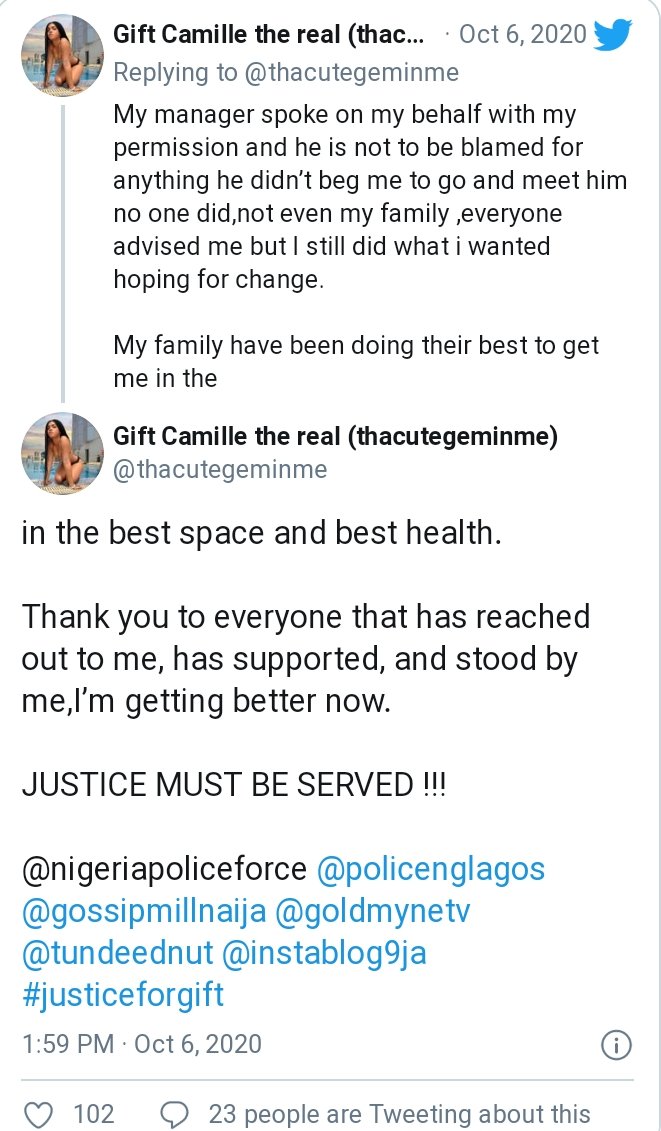 My manager spoke on my behalf with my permission and he is not to be blamed for anything he didn’t beg me to go and meet him no one did, not even my family, everyone advised me but I still did what I wanted hoping for change. My family have been doing their best to get me in the in the best space and best health. Thank you to everyone that has reached out to me, has supported, and stood by me, I’m getting better now. JUSTICE MUST BE SERVED !!!
