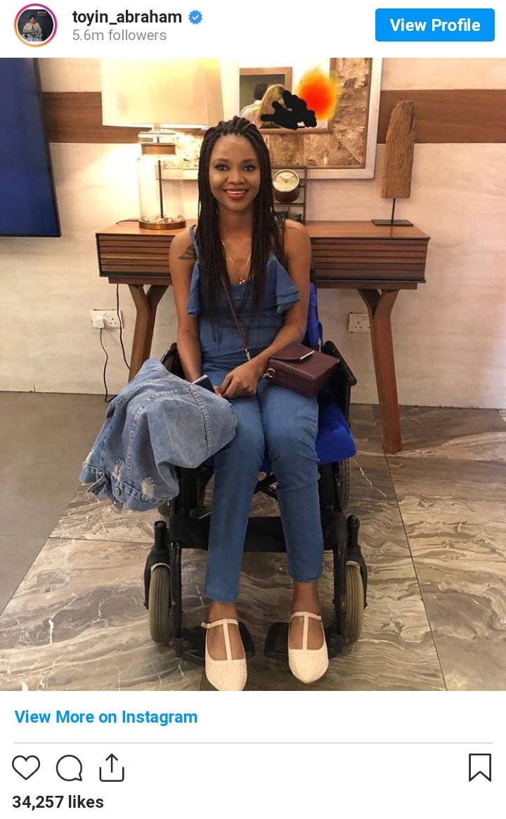 Toyin also shared the photo of her friend Nike on a wheel chair and she wrote:“This is my family friend Adenike @nikeadekanle .. She wasn’t born like this, it was a stray bullet from the Nigeria police on the 23rd of July 1996 around 3pm in Apata Ibadan and she was in the hospital for over a year. Not even a call or check up or Bill payment by the police.