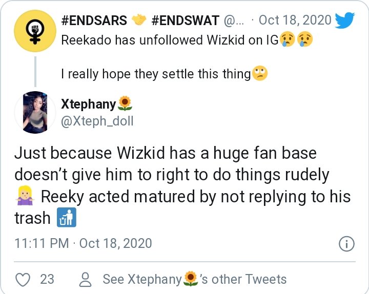 Another Twitter user called Bayor_arts quoted Fej’s tweet and noted that Wizkid has also returned Reekado’s gesture by unfollowing him.
