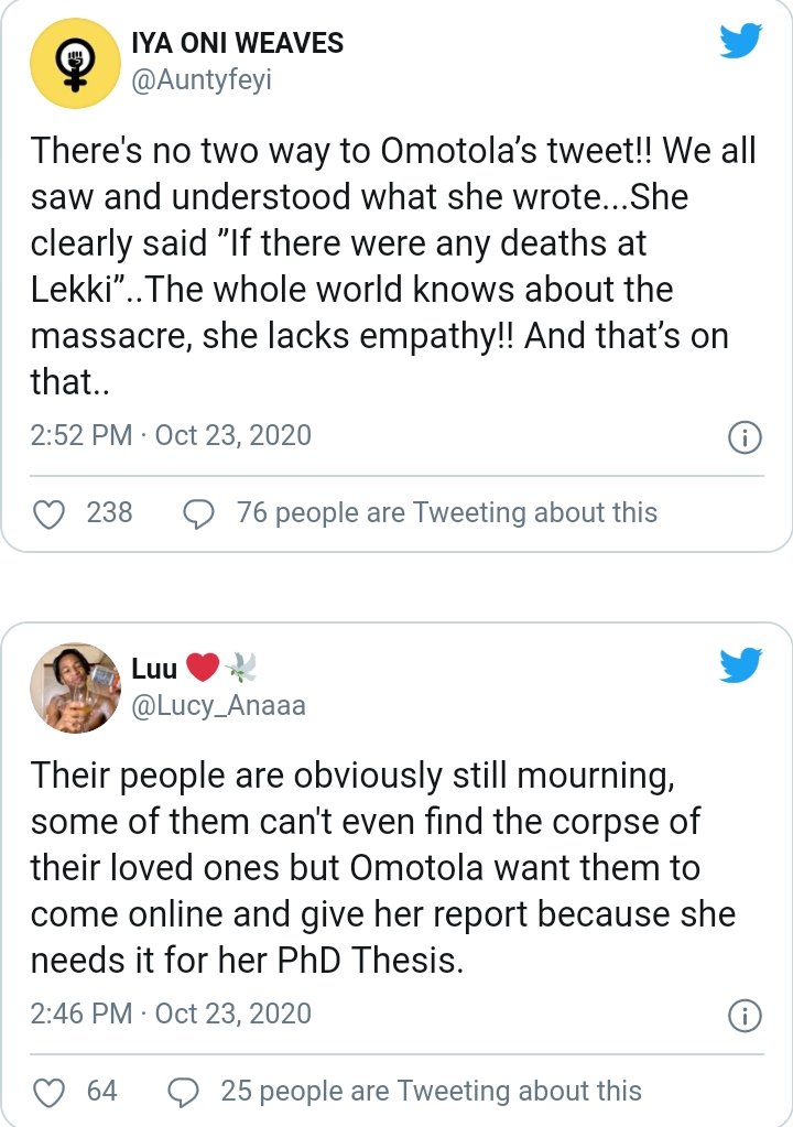 She wrote:”No lies, No fear. If People died during the Lekki Toll Assault, let their people speak out please and if there were No deaths then enough with the sensationalization because it does not remove from the Crime that happened. Peaceful protesters were attacked and we will like to know why and by whom.”