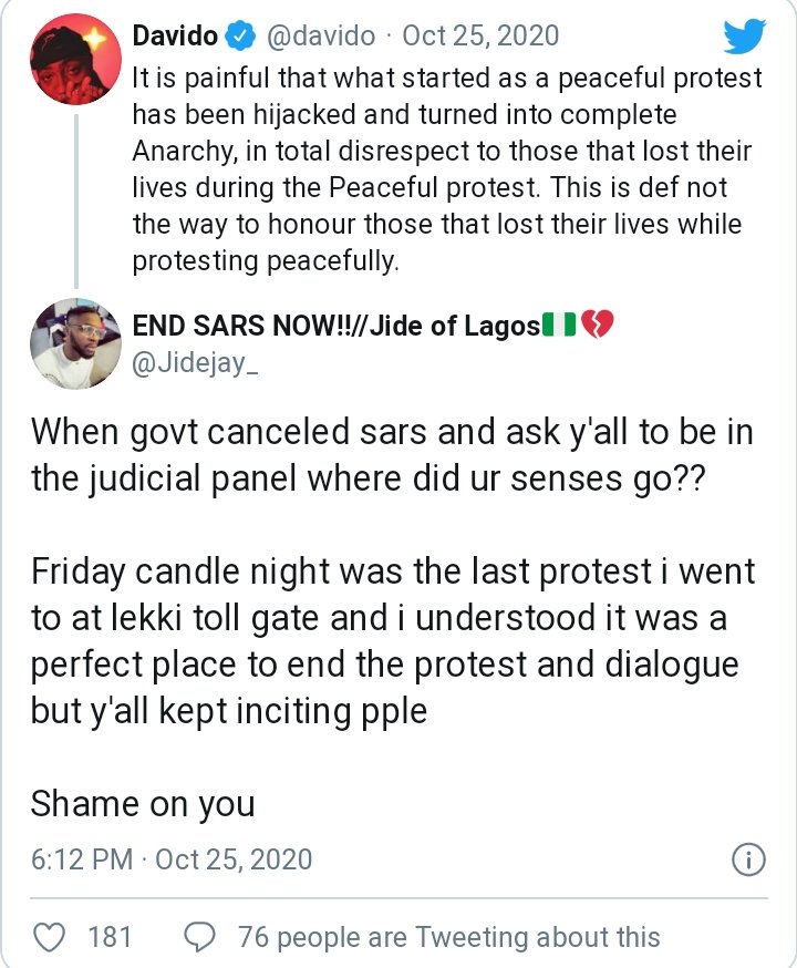 Music star David Adeleke popularly known as Davido has shown concern for the actions taken by some Nigerians who have gone against the initial plan of the peaceful protest.